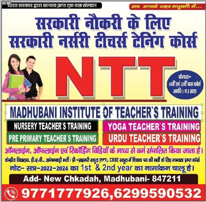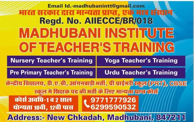Welcome to Madhubani Institute Of Teacher's Training is Running Under the Aegis of MSME Registered (UDYAM-BR -10-.........) With Government of India. And also An ISO 9001:2015 Certified Company, Since 2024 We are Providing Educational Facilities. भारत सरकार द्वारा मान्यता प्राप्त एक मात्र संस्थान MADHUBANI INSTITUTE OF TEACHER'S TRAINING. अब आपके शहर मधुवनी में भी NTT (Nursery Teacher Training) and B.Ed & D.EL.ED सरकारी शिक्षक बनने का सपना साकार होगा!